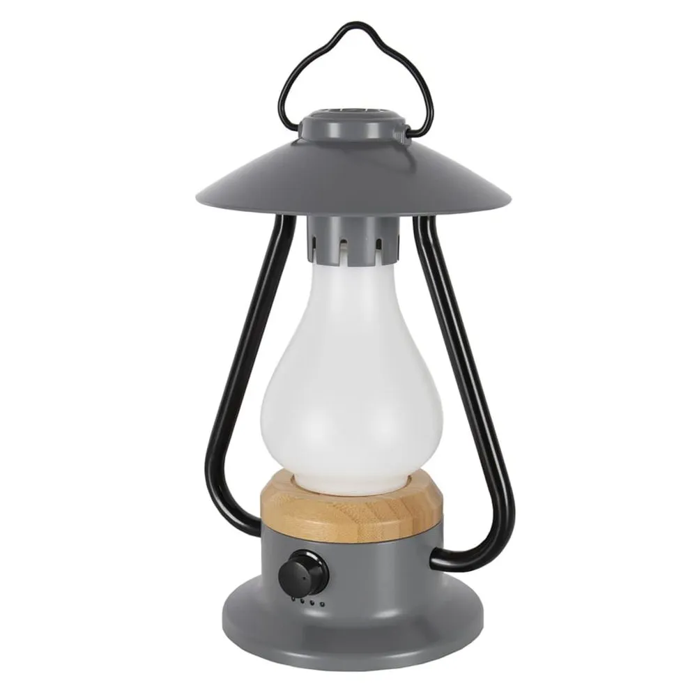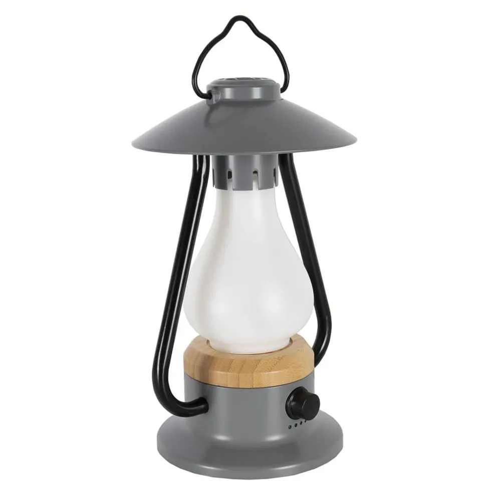 Add a great vibe to the campsite with this LED Woolton lantern from Bo-Camp. As it is rechargeable, it is perfect to use at the campsite and in your garden. The camping light featuring an outdoor design and a stepless dimmer function gives a pleasant warm white LED light. The stylish camping light is equipped with a bamboo base and a plastic housing. It can also be hung up thanks to the handle. The rechargeable table lamp can be charged through the included USB cable. It operates on one rechargeable Li-ion battery. Colour: Grey and brown Material: Plastic and bamboo Dimensions: 17 x 19 x 28 cm (L x W x H) Hanging camping light Warm white LED light Stepless dimming function Rechargeable through USB cable Required battery: 1 x 5 V Li-ion rechargeable battery (included) Delivery includes: 1 x USB cable