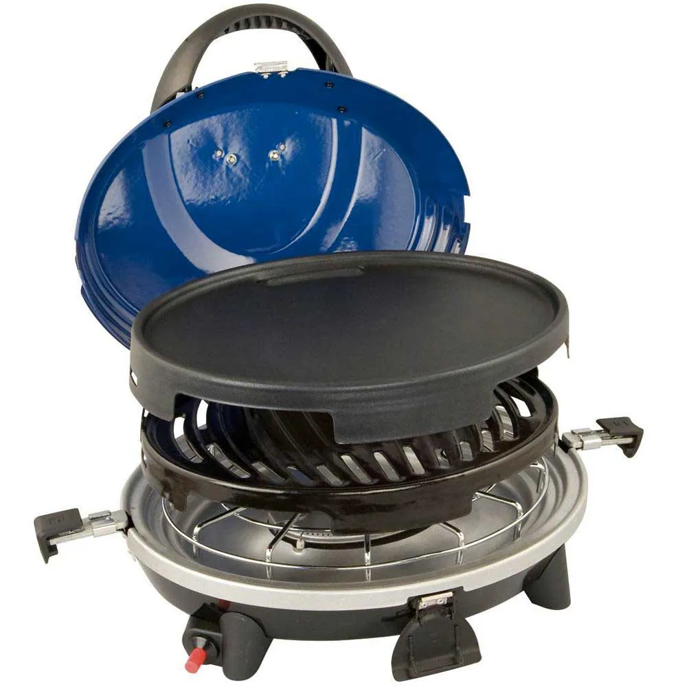 A compact and versatile, 3 in 1 stove with flexible cooking options including a grill, griddle and high burner. The 3 in 1 Grill Stove?s compact design disguises a large cooking surface which is removable and has an integrated grease pan for easy cleaning. The secure locking latch ensures easy transportation and storage. The stove runs of Campingaz CV valve cartridges for extra portability and convenience.