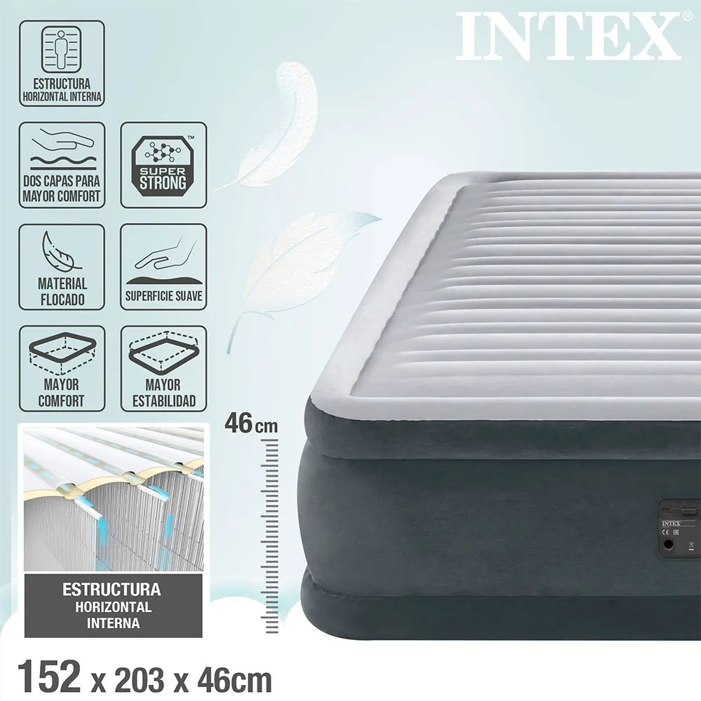 Intex inflatable mattress with Fiber-Tech technology. From the Comfort Plush line, the measurements are: 152×203 and with a height of 46 cm Fiber-Tech: technology of thousands of highly resistant polyester fibers that do not stretch with time or use, offering lasting stability Gray mattress and with a flock finish it provides a soft, elegant and velvety texture The inflatable mattress is double and is designed for two people use Single edge structure for greater firmness and horizontal construction for a greater rest The inflation time is 3 minutes by electric pump 220 Integrated system 2-1 / 240V for fast inflation and deflation Intex inflatable bed supports a maximum weight of 273 kg and its double height provides easy access and greater resemblance to traditional mattresses Water and puncture resistant inflatable mattress Easy to deflate and Compact fold to store in a carrying bag (included). Mattress weight: 9 kg