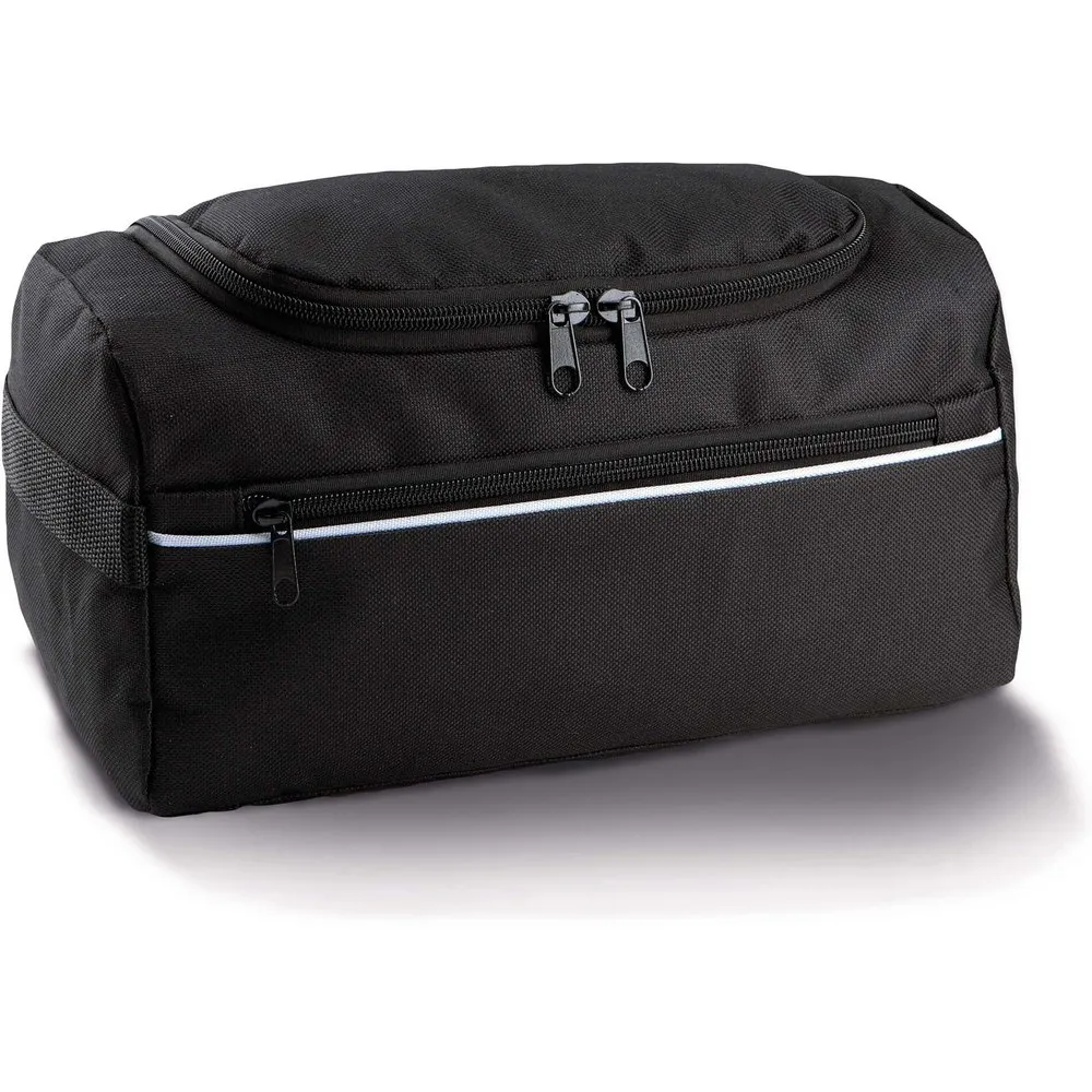 600D polyester toilet bag, flap on top equipped with a hanging hook, inside pocket, large front pocket, side handle.
