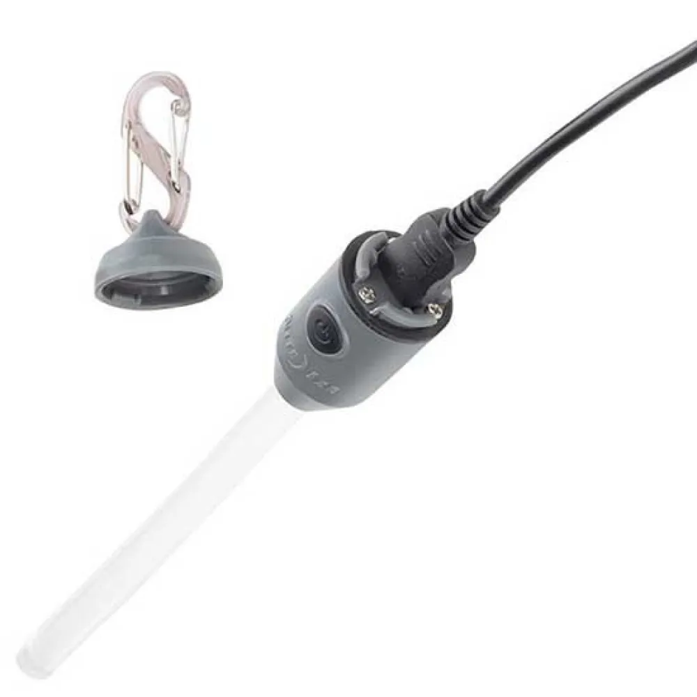 – Unscrew detachable top with included S-Biner to access charging port