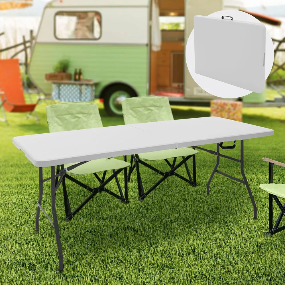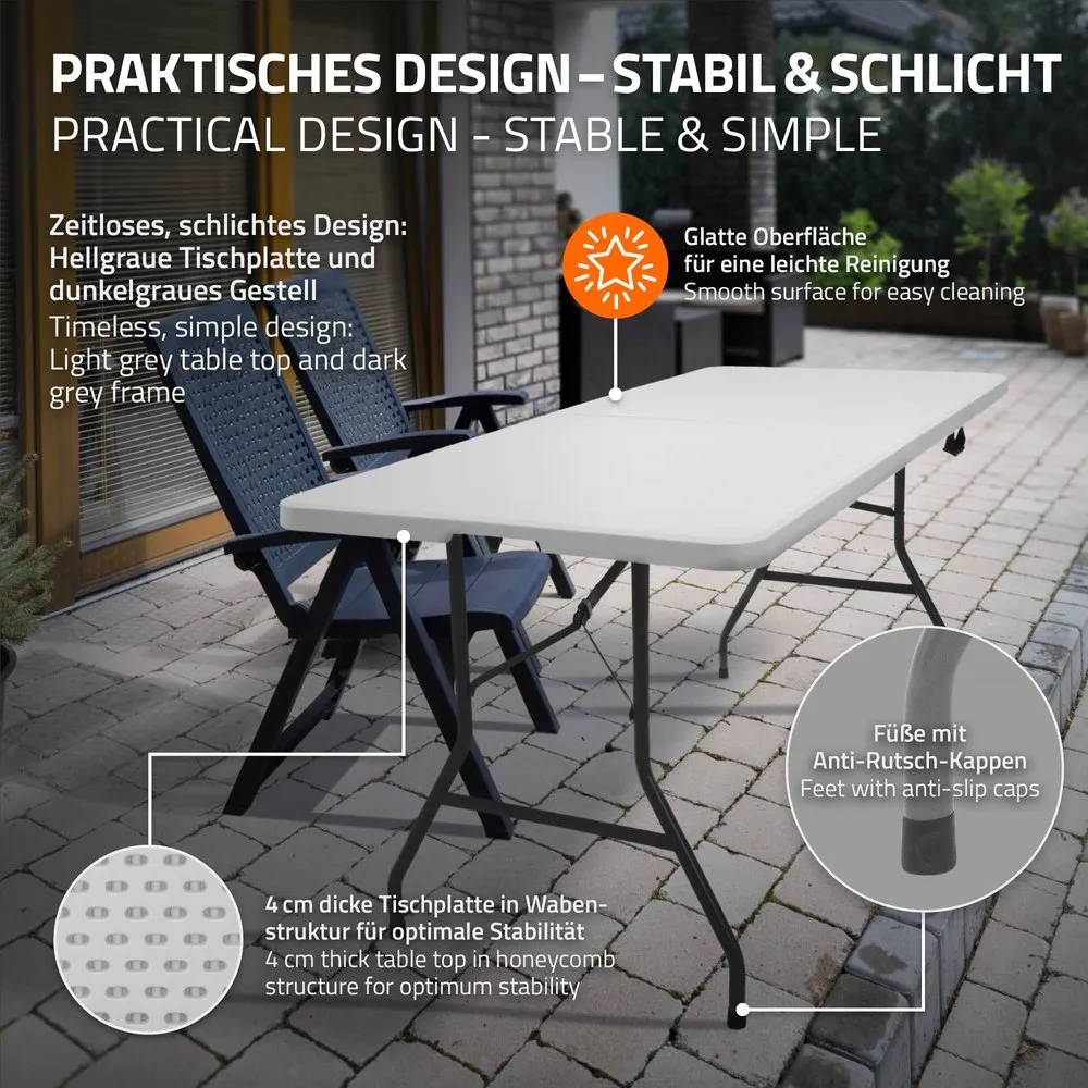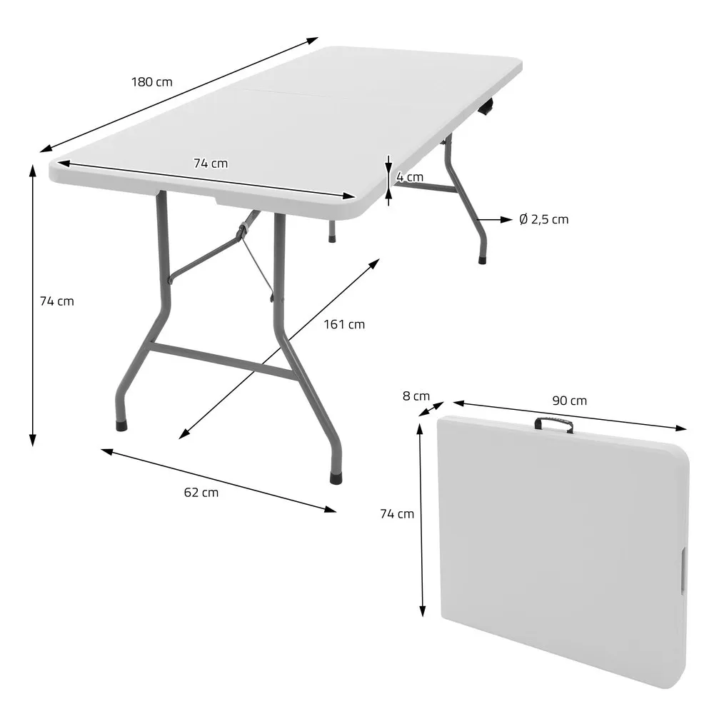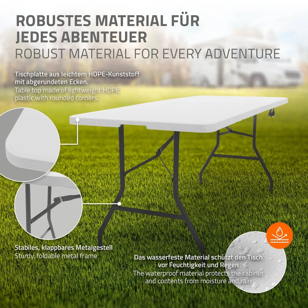 Made of weatherproof HDPE plastic with a steel frame, the extra-wide folding table is particularly stable and sturdy.