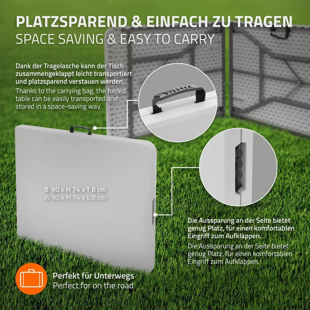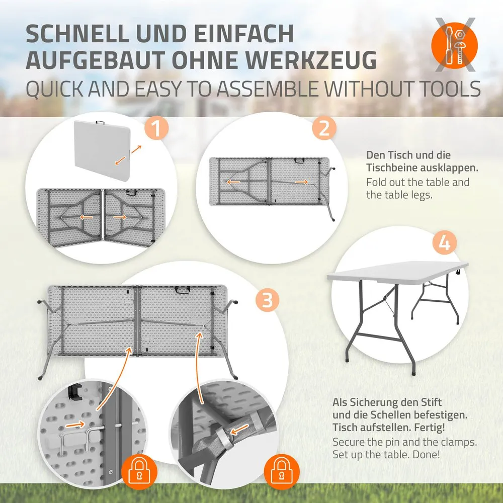 The table is set up in no time at all, and metal pins are pushed through the underside for a secure hold. You can also take this table with you when camping, thanks to the integrated carrying handle it is easy to transport. When the table is no longer needed, it can simply be folded up and stored in a space-saving way. The material is easy to clean and can be wiped clean. It is therefore suitable for both indoor and outdoor use. The feet are also equipped with rubber pads. Assembly is not required, simply unfold and you´re ready to go.